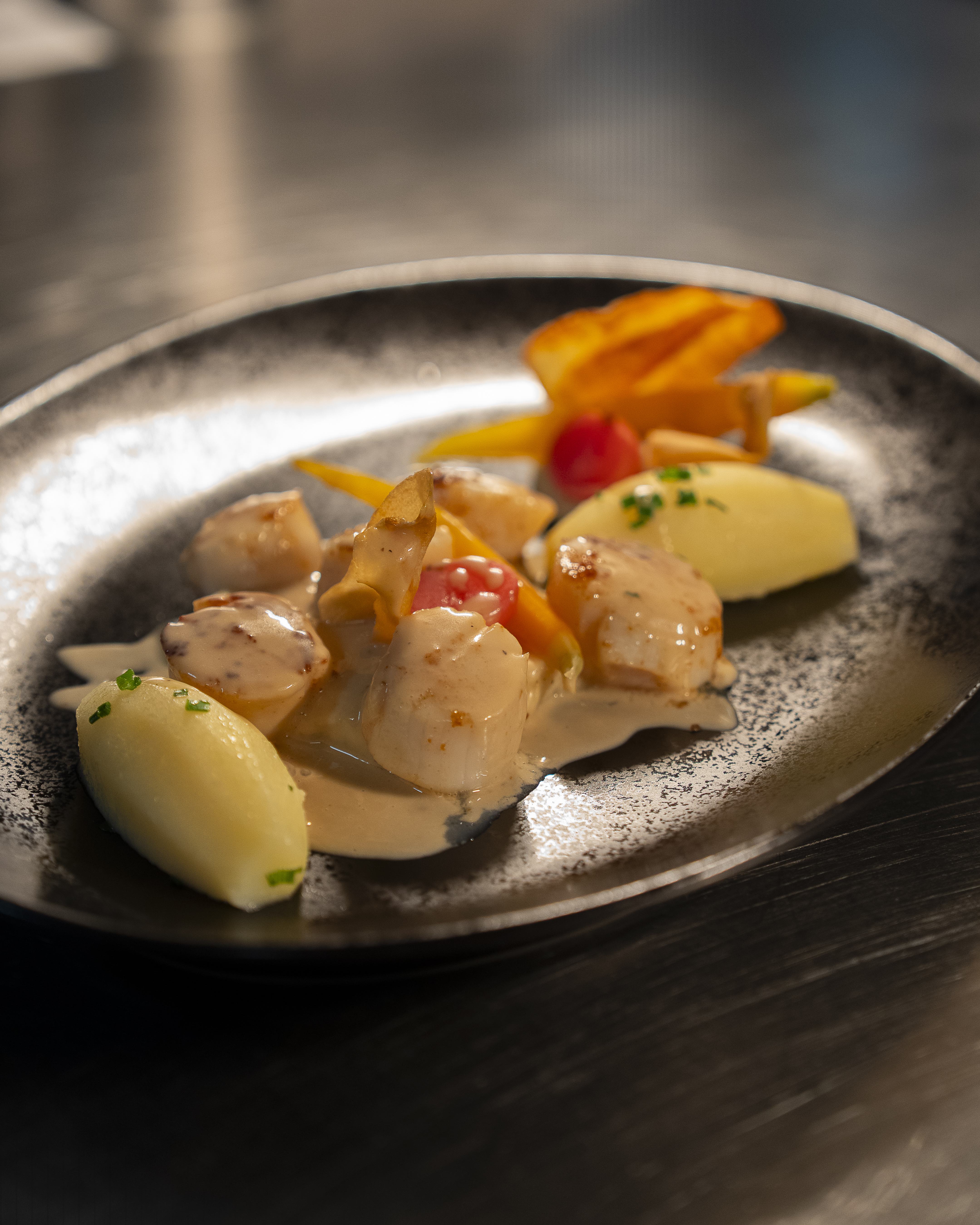 - Noix de Saint-Jacques fraiches snackées, jus gingembre, Purée de panais vanille et noisettes torréfiées