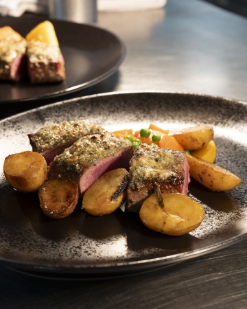 - Filet d’agneau grillé en croute d’herbes, Ails confits et jus corsé