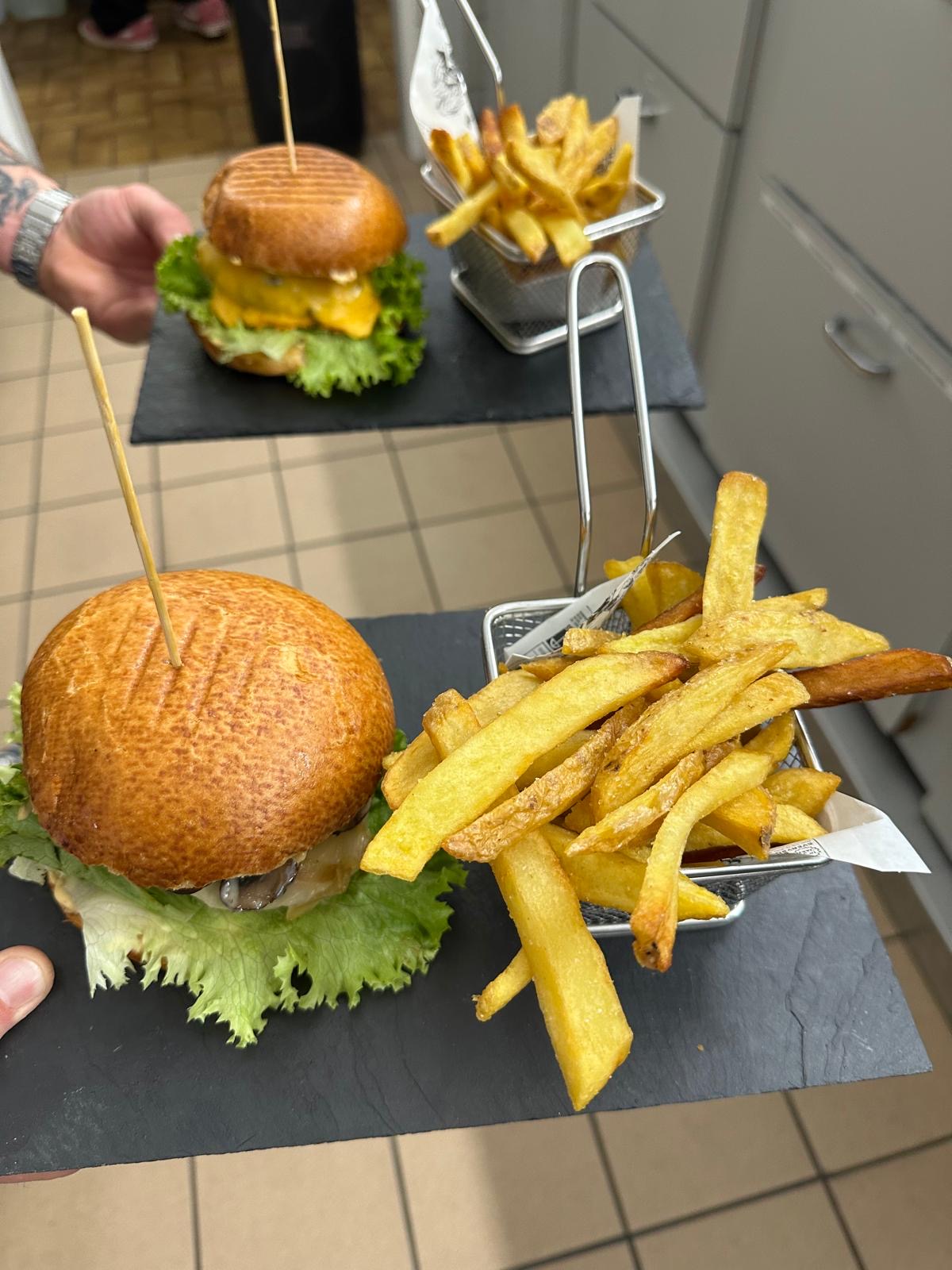 - Burger montagnard, tranche panée de poulet, salade, tomate, oignons, champignons fromage raclette, cornichons, sauce burger