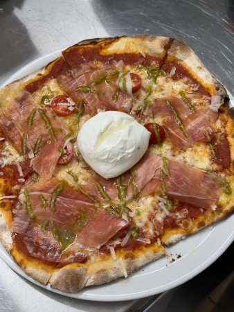 - Time Out : sauce tomate maison, mozzarella, jambon cru, roquette, Burratina, tomates cerises, copeaux de parmesan, pesto, -- / Fr. 27.-