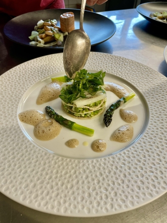 (1) Poitrine parfumée à anis, asperges pommes de terre croustillantes