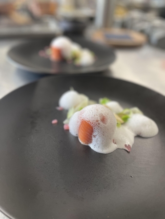 2. Truite du Jura rhubarbe, nuage lait d'amande fèves fraiches