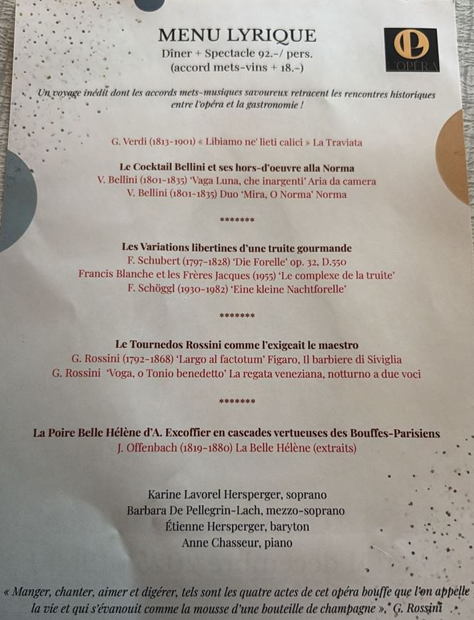 Agenda du 6 mars 2026 au 22 mars 2026 Auberge du Graitery Saucisse au Marc ... et sa garniture.Cuite dans un véritable alambicFr. 28.- pp du 10 mars 2026 au 13 mars 2026 La Grange Menu ... Salade, Papet Vaudois, dessert, Fr. 22.-Servi à midiIl est conseillé de réservé au 079 374 92 57 ou à info@restaurantlagrange.ch du 18 mars 2026 au 20 mars 2026 La Grange Menu ancien ... Salade, Rognons de veau à la moutarde, rösti, Fr. 22.-Servi midi et soirIl est conseillé de réservé au 079 374 92 57 ou à info@restaurantlagrange.ch du 25 mars 2026 au 27 mars 2026 La Grange Menu ... Salade, Joues de porc braisées, pommes fondantes, dessert, Fr. 22.-Servi à midiIl est conseillé de réservé au 079 374 92 57 ou à info@restaurantlagrange.ch 26 mars 2026 L'Opéra Soirée lyrico-gustative .. Dîner spectacle - Menu lyrique dès 19h30Dîner + Spectacle Fr. 92.- pp (avec accord mets - vins + Fr. 18.-)Un voyage inédit dont les accords mets - musiques savoureux retracent les rencontres historique entre opéra et la gastronomie !Découvrez le menu ici ...