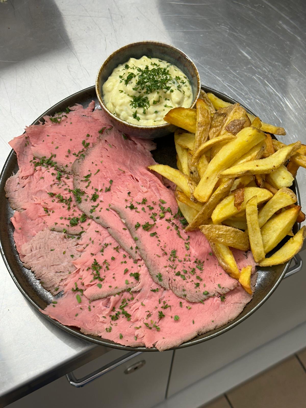 - Le roastbeef, sauce tartare maison avec frites ou salade